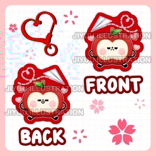 This keychain is clear and about 2.5 inches tall. It is double sided and the front and back artworks are different! The artworks are well protected with a clear epoxy coating. The keychain also comes with a red heart shaped keyring clasp and a heart or star charm.
