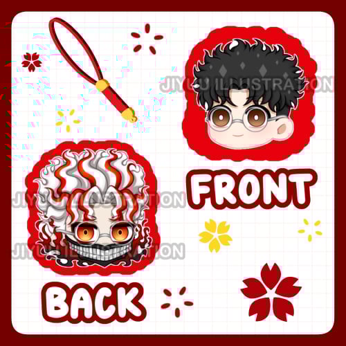 These phone charms are clear and about 1.5 inches tall. They are double sided and the front and back artworks are different! The artwork is sandwiched between two acrylic boards and well protected. The phone charms also come with a color coordinated phone strap and a star charm.
