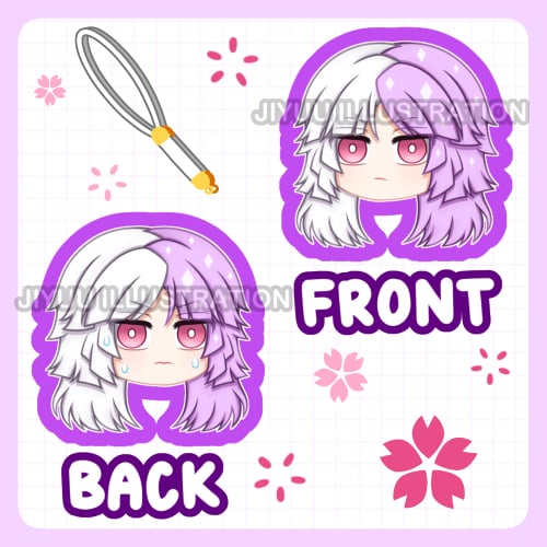 These phone charms are clear and about 1.5 inches tall. They are double sided and the front and back artworks are different! The artwork is sandwiched between two acrylic boards and well protected. The phone charms also come with a color coordinated phone strap and a star charm.